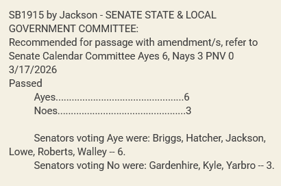 Having cleared the Senate State & Local Government Committee, SB1915 will also soon be given a floor date by the Senate Calendar Committee. House companion HB1710 is on the House State & Local Government Committee schedule for today, March 18.