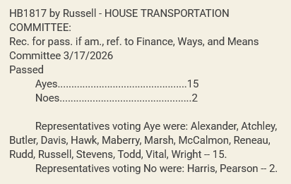Senate companion SB1748 by Sen. Janice Bowling has cleared the Senate Transportation and Safety Committee and is scheduled for a full Senate vote on Thursday, March 19.