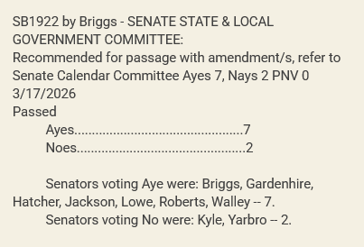 During the Senate State & Local Government Committee there were a few general clarifying questions for bill sponsor Richard Briggs, and the vote was 7-2 in favor along party lines. SB1922 will now head to the Senate Calendar Committee to secure a date for a vote.