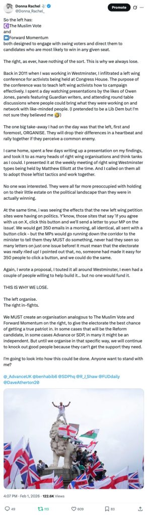 I’ll admit it, I’m as guilty as anyone on the right of perpetuating the failure. Look at what I’ve done here: spotted the problem – that while the left organise, the right write papers –and immediately reached for my laptop to write a carefully argued paper on why we shouldn’t do that. Oh, the irony!
