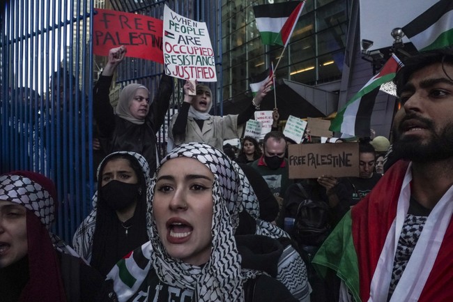 …Supporters blocked their faces and bodies with masks and keffiyehs, a scarf connected to Palestinian liberation. They grew agitated and combative as reporters pressed questions.