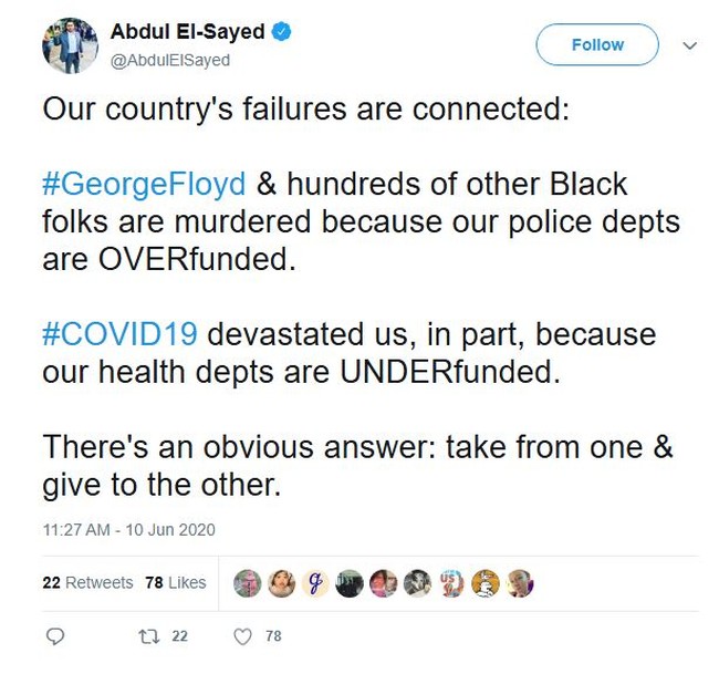 “Most major US cities spend WAY TOO MUCH on police departments to police poverty & WAY TOO LITTLE on public schools, health departments, recreation departments, & housing to eliminate poverty. Fixing that is what the #Defund movement is about,” El-Sayed wrote in a since-deleted post from June 2020.