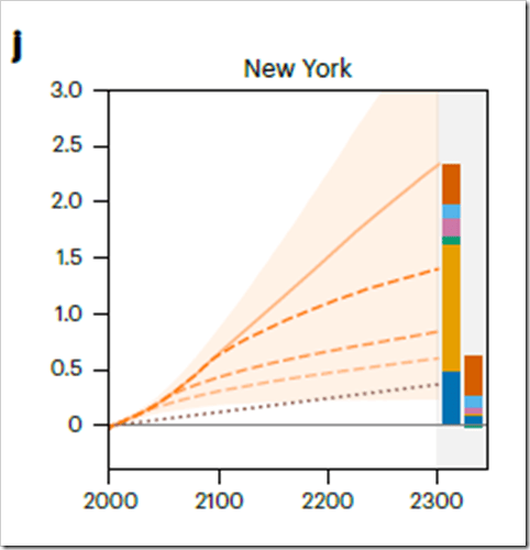 Take the projections for New York, for example. They project a rise of about 2.3 metres, which works out at 8mm a year. In reality the rate is less than 3mm a year, and has been since the late 19th century. There has been no discernible acceleration and a third of the rise is due to glacial isostasy – the land mass in the eastern US has been sinking since the Ice Age ended.