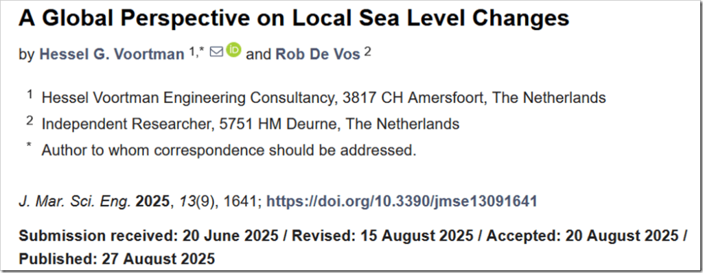 It says: ‘In 2021, the IPCC published new sea level projections. For the first time, the projections gave insight into expected relative sea level rise locally. A prudent designer of coastal infrastructure will want to know how the local projections compare to local observations. That comparison, to date, has not been made. We compared local projections and observations regarding the rate of rise in 2020. We used two datasets with local sea level information all over the globe. In both datasets, we found approximately 15 per cent of the available sets suitable to establish the rate of rise in 2020. Geographic coverage of the suitable locations is poor, with the majority of suitable locations in the Northern Hemisphere. Latin America and Africa are severely under-represented. Statistical tests were run on all selected datasets, taking acceleration of sea level rise as a hypothesis. In both datasets, approximately 95 per cent of the suitable locations show no statistically significant acceleration of the rate of sea level rise. The investigation suggests that local, non-climatic phenomena are a plausible cause of the accelerated sea level rise observed at the remaining 5 per cent of the suitable locations. On average, the rate of rise projected by the IPCC is biased upward with approximately 2 mm per year in comparison with the observed rate.’