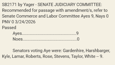 The companion Senate Bill (SB2171) passed in the Senate Judiciary Committee on March 24th, and has been referred to the Senate Commerce and Labor Committee.