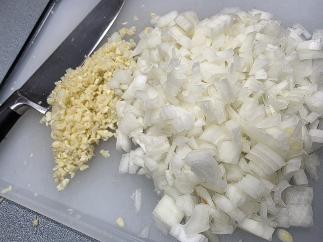 So when you’ve got it drained off (if you need or want to drain it), dump the onions in first, mix them in good, and stir for a couple of minutes until they start to get that sweating look. Then add your garlic.