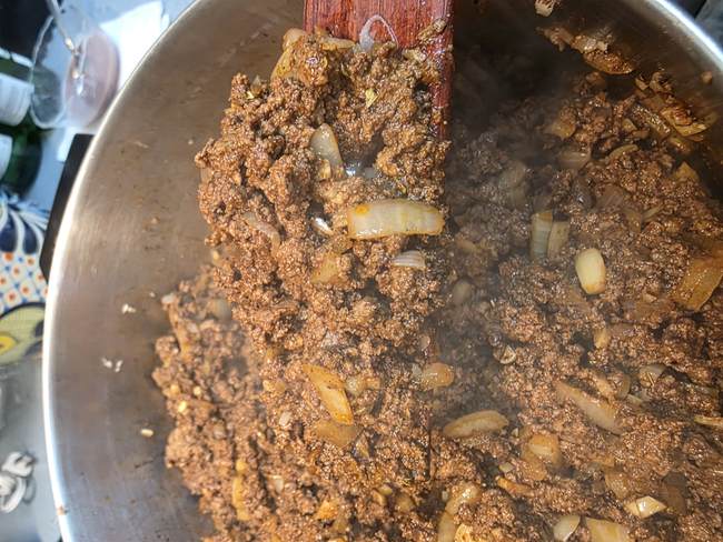 Now, the kitchen probably smells like a million bucks, but that ain’t nuthin’ yet. Take your little bowl of mixed up aromatics, and dump it over the meat mixture. Stir everything thoroughly together so that the heat will hit every last one of those spices. It will bloom the natural oils in them.
