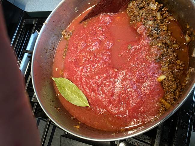 That’s your cue to grab the tomato puree, some water, the bay leaf, and salt and pepper.