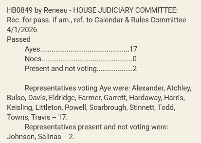 There were no comments or questions from committee members, and they proceeded to vote 17-0, with two Democrats marking themselves “Present Not Voting”, in favor of sending HB0849 to the House Calendar & Rules Committee where it will be given a date for a floor vote.