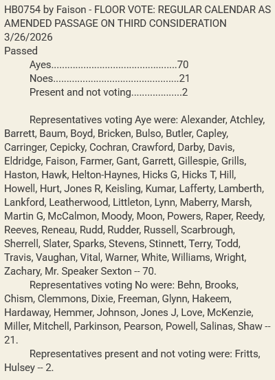 The bill passed with a 70 to 2 vote with Republican Representatives Monty Fritts (R-Kingston-District 32) and Bud Hulsey (R-Kingsport-District 2) present but not voting. The companion bill was referred to the Senate Calendar Committee on Tuesday.