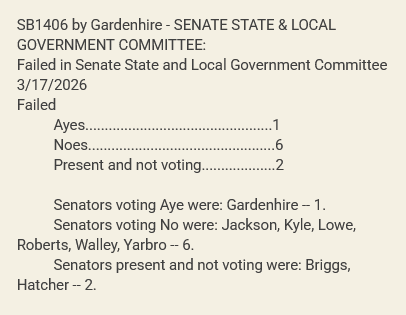 The bill ultimately failed in the Senate State and Local Government Committee when only the bill’s sponsor voted in favor, and NO votes coming from Republican Senators Adam Lowe, Kerry Roberts and Page Walley with Senators Richard Briggs and Tom Hatcher counted as present but not voting.