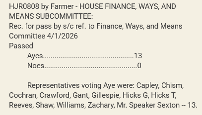 There was no discussion or further comment by members of the House Finance, Way, & Means Subcommittee, and the bill unanimously passed 13-0. HJR0808 will now proceed to the full Finance, Ways, & Means Committee for consideration.