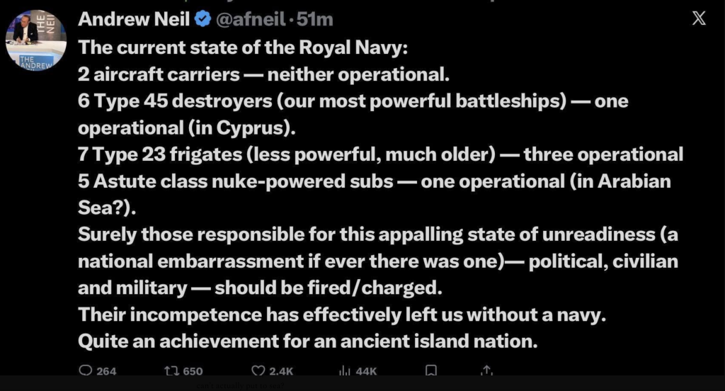 Here is the state of the Royal Navy, according to AI summary of what was once the greatest and most feared naval force on the planet: