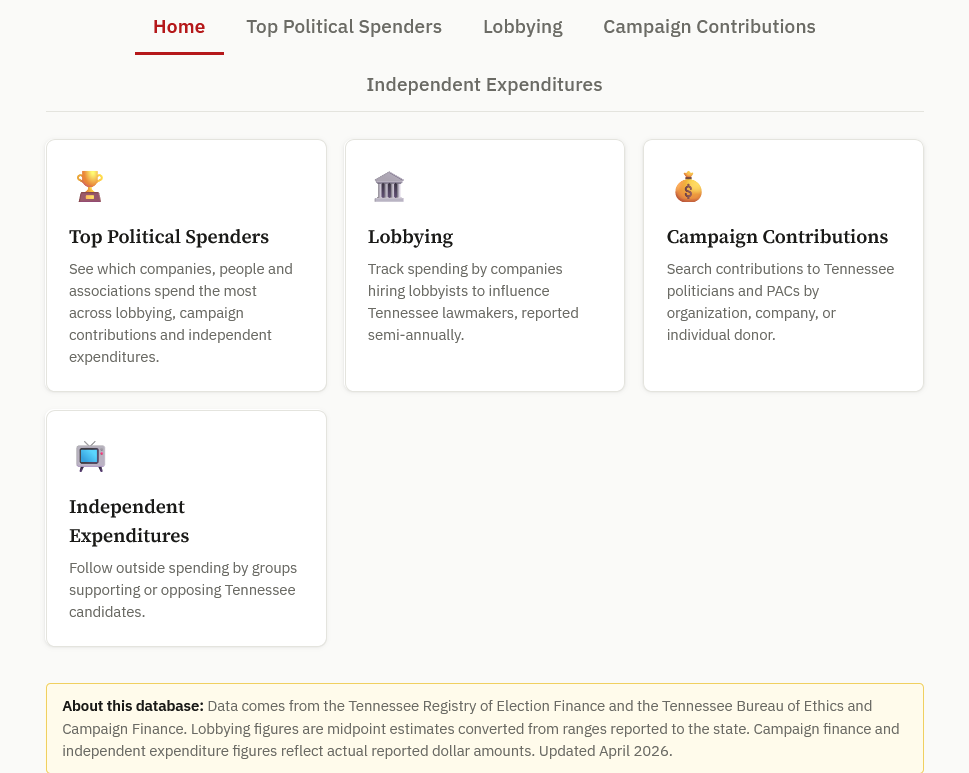 Independent expenditures were also reported as part of the Tennessee Bureau of Ethics and Campaign Finance campaign database under expenditures. We used a similar method for donations to compile a complete spending list.