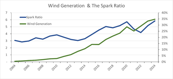 Until 2014, when wind generation was relatively small, the spark ratio was more or less constant, and electricity tracked the price of gas. As the proportion of wind increased, electricity became more expensive. Following the hiatus of the invasion of Ukraine, the spark ration (and thus the electricity price) tracks the proportion of wind. Why? Because the more wind we have the more often we must turn off gas generators, which increases the price of gas-generated electricity. Gas remains the source of 31 per cent of our generation, about the same as wind.