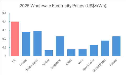 The UK has some of the most expensive electricity in the world. The chart below makes the point. (Data from The World Population Review.)