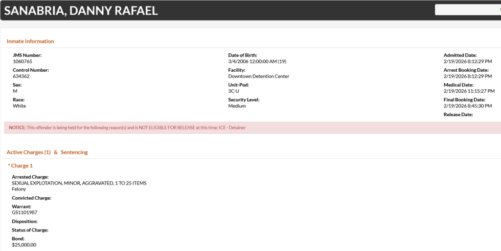 - Sanabria was charged with aggravated sexual exploitation of a minor. He was booked on a $25,000 bond.
