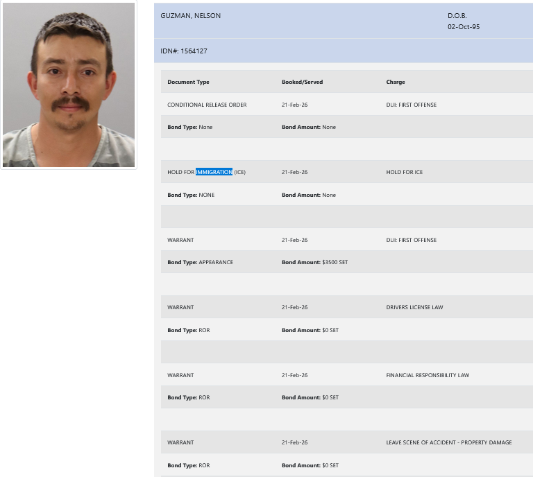 - Guzman was charged with DUI (first offense), driver’s license law, and financial responsibility law. He was booked on a $3500 bond.