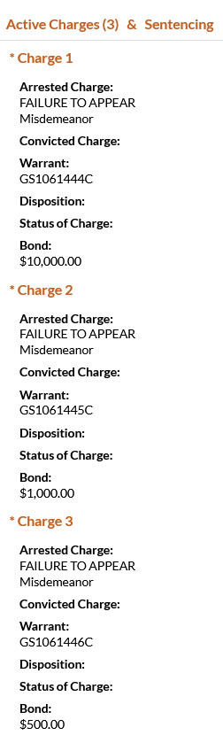 - Flores was charged with three counts of failure to appear and was booked on an $11,500 bond. He failed to appear in court to answer to 2025 charges of DUI, implied consent, and driving on a suspended license.