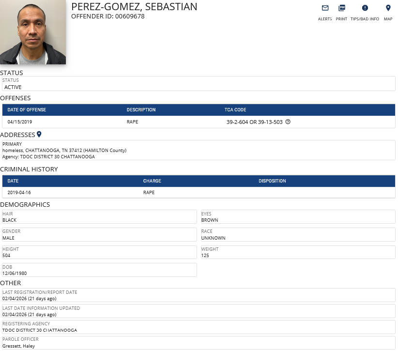 At some point, Perez-Gomez reentered the U.S. and was convicted in 2019 of the rape of a 13-year-old East Ridge girl. He was sentenced to 8 years in prison with the possibility of getting 15% of the sentence off for good behavior.