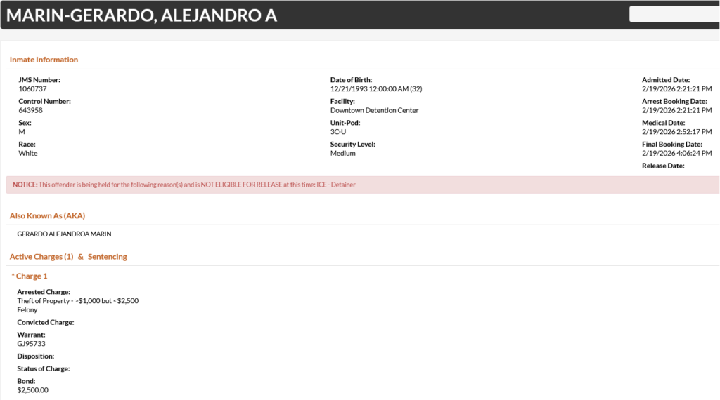 - Marin-Gerardo was charged with theft of property between $1000 and $2500. He was booked on a $2500 bond.
