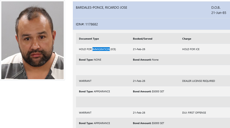 - Bardales-Ponce was charged with DUI (first offense) and dealer license required. He was booked on a $10,000 total bond.