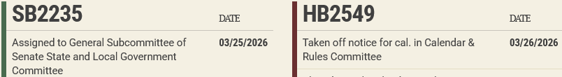 Senate Bill 2235/House Bill 2549 was removed from consideration in the House in late March and failed to advance from the Senate State and Local Government Committee.