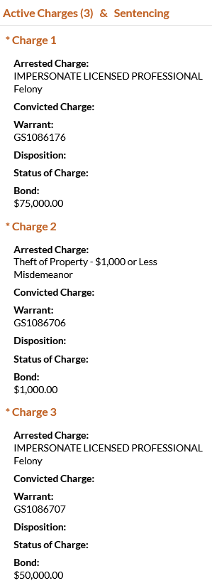 Charged with two counts of impersonating a licensed professional and theft, 36-year-old Marissa Jean Denton was being held on a $126,000 bond while scheduled to appear in court yesterday.