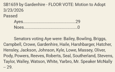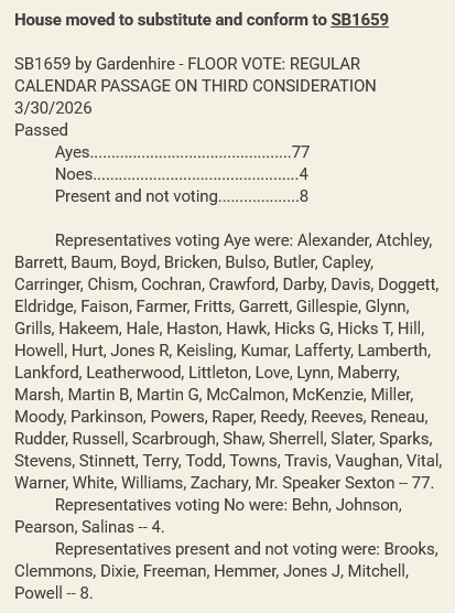 The Senate unanimously passed SB1659 in a 29-0 vote on March 23 while the House saw less bipartisan support for HB1454, reflected in the 77-4 vote on March 30.