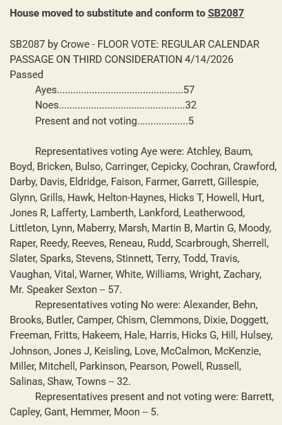 It was not very clear why so many members, including several conservatives, abstained or voted against the bill as the question was called by Rep. Pat Marsh, ending debate before any other Republicans spoke on the issue.