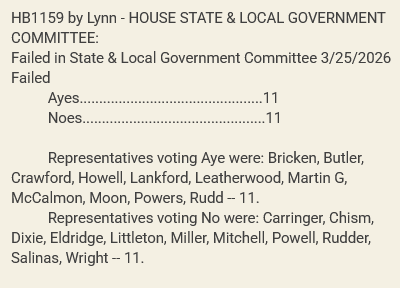 While the Senate companion bill, SB0831, is scheduled for the Senate State and Local Government Committee on Tuesday, March 31, it will likely be taken off notice or general subbed with the failure of HB1159.