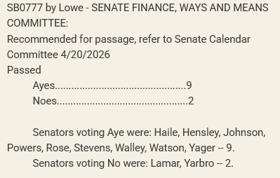 The Senate companion bill, SB0777, saw much greater success on Monday, passing the Senate Finance, Ways, and Means Committee 9-2 along party lines and being referred to the Calendar Committee to be scheduled for a floor vote.