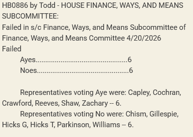 If just one of these Republicans had voted “Yes” or abstained from voting, the bill would have passed to the full House Finance, Ways, and Means Committee.