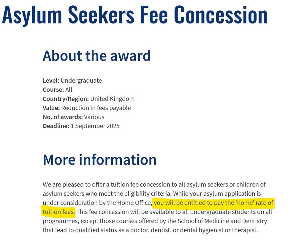 Queen Mary also offers ‘Asylum Seekers Fee Concession’ to all asylum seekers or children of asylum seekers ‘who meet the eligibility criteria’. They are entitled to pay the domestic rate of tuition fees instead of the fees charged to overseas students.