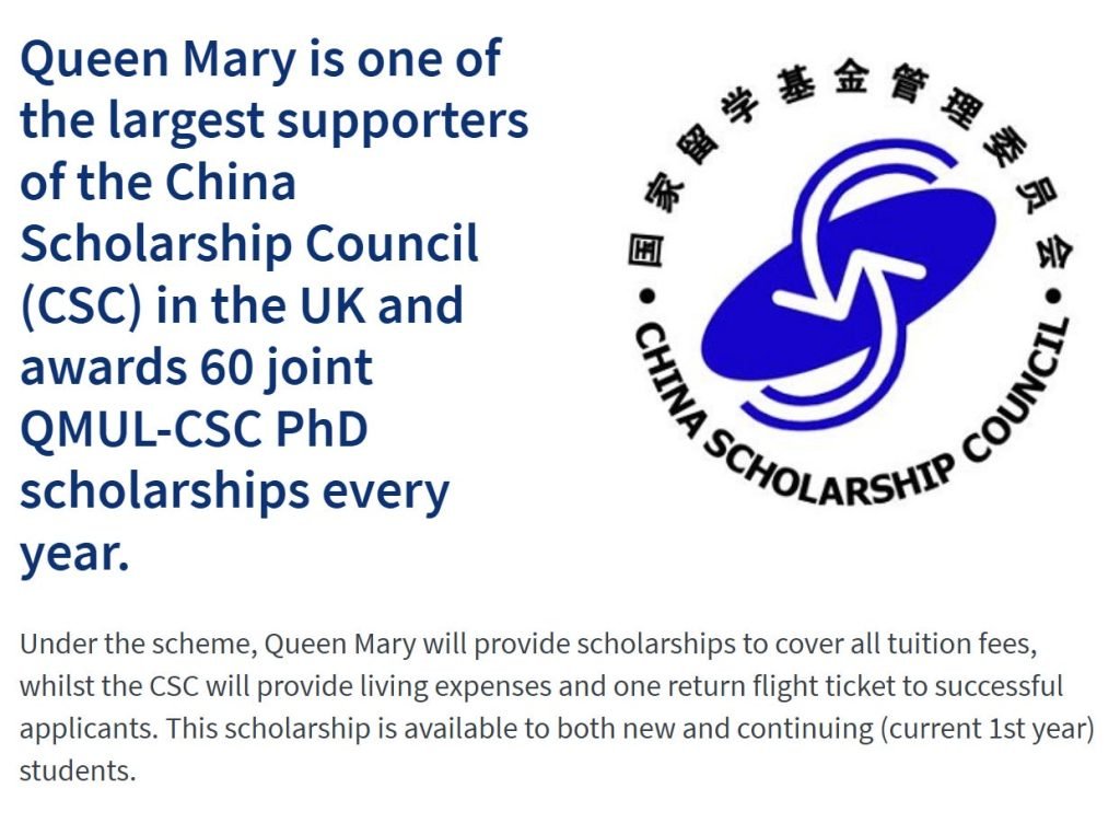 Each year Queen Mary offers 60 joint PhD scholarships with the China Scholarship Council whereby Queen Mary cover full tuition fees for four years and the Chinese authorities fund a cost of living stipend. The annual PhD tuition fee for international students is £23,200 for non-lab-based subjects and £28,950 for lab-based students. Based on an average £25,000, this is equivalent to a total of £1.5million each year underwritten by the university. Only Chinese nationals quality to apply for funding.