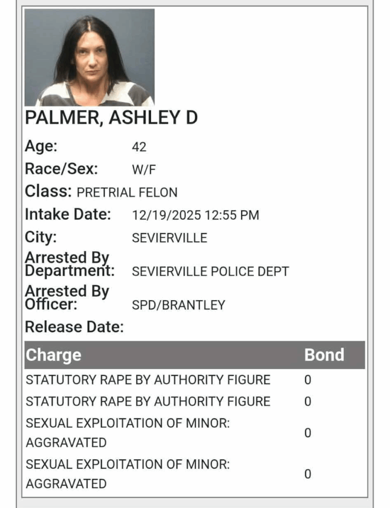 Ashley Palmer, 42, was arrested by the Sevierville Police Department (SPD) on Friday, Dec. 19, and is facing four different charges, two counts of statutory rape by an authority figure and two charges of aggravated sexual exploitation of a minor.