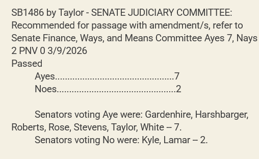 SB1486 passed the Senate Judiciary Committee on Monday, March 9th with 7 Republican votes in favor and 2 Democrat votes in opposition. The bill now moves forward to the Senate Finance, Ways, and Means Committee.