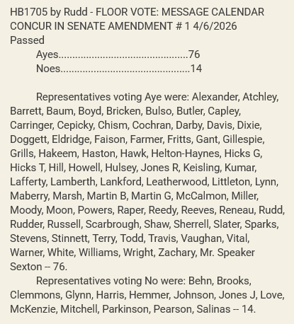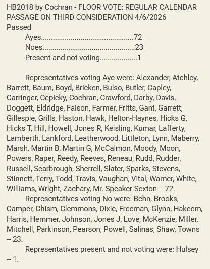 During the House floor session on Monday, there were no comments or questions, and the vote was 72-33 in favor along party lines, with Republican Bud Hulsey marking himself “Present Not Voting”. The Senate companion, SB1486, is awaiting a date for a floor vote.