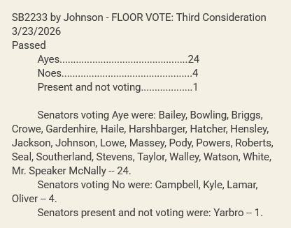 In the House, the companion HB1704 passed on the floor 73-22 last week along party lines, so the last hurdle this bill must clear before becoming law is the full Senate.