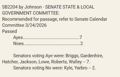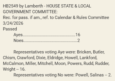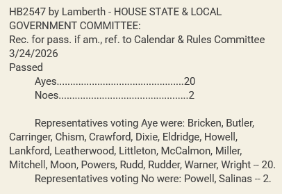 It will now go to the House Calendar & Rules Committee to schedule a full House vote. The Senate companion, SB2235, is set to be heard in the Senate State and Local Government today, March 25.