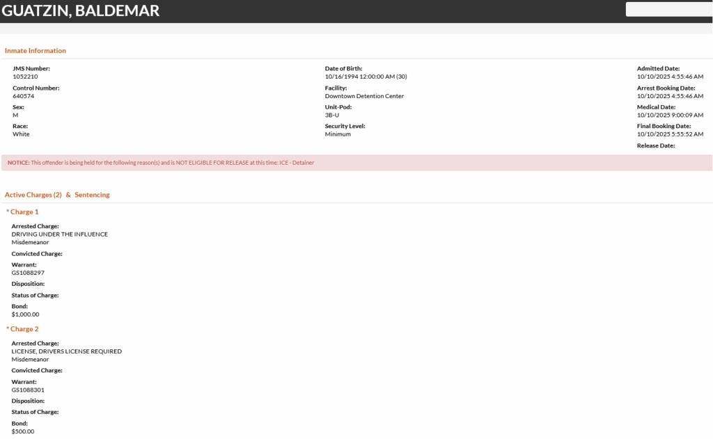 Police also arrested 30-year-old Baldemar Guatzin on October 10. Guatzin was charged with driving under the influence and driving without a license. He was booked on a $1500 bond.