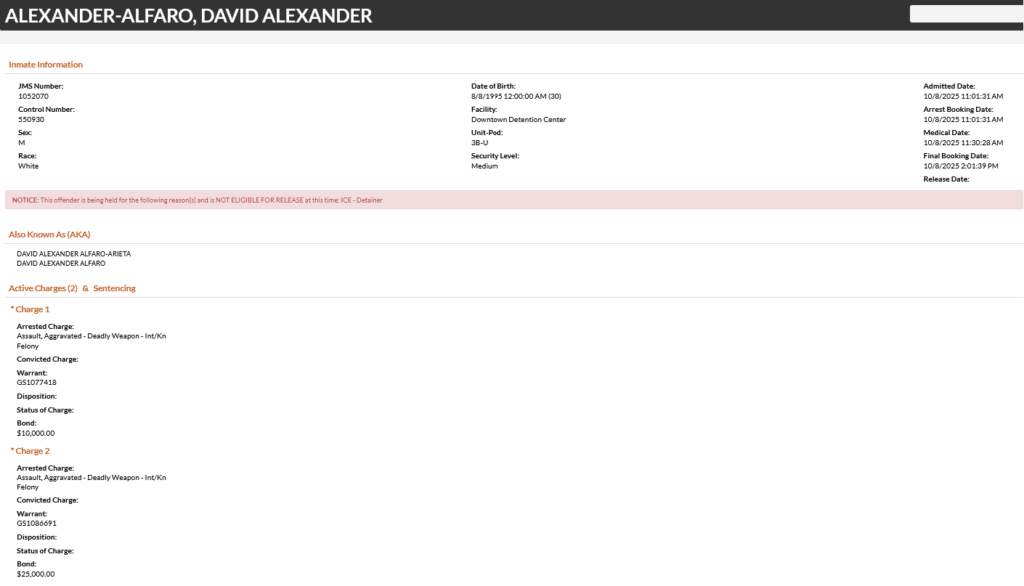 30-year-old David Alexander Alexander-Alfaro was arrested on October 8. He was charged with two counts of aggravated assault with a deadly weapon and was booked on a $35,000 total bond. His current charges stem from two incidents: one occurring on July 5 and one on August 28.