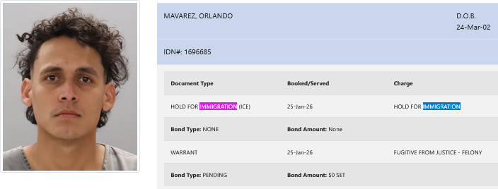 - Mavarez was arrested for being a fugitive from justice and was booked without bond.