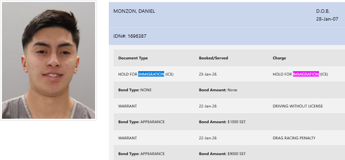 - Monzon was charged with driving without a license and drag racing. He was booked on a $10,000 total bond.