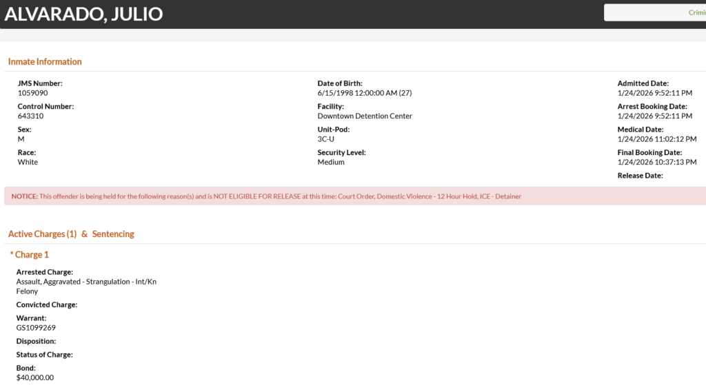 - Alvarado was charged with aggravated assault (strangulation) and was booked on a $40,000 bond. He is scheduled to appear in court on the felony charges on January 27.