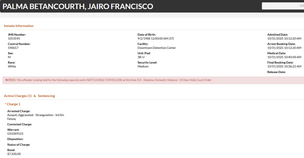 • Betancourth was charged with aggravated assault (strangulation). He was booked on a $7500 bond. He was previously charged with having no driver’s license in 2020.