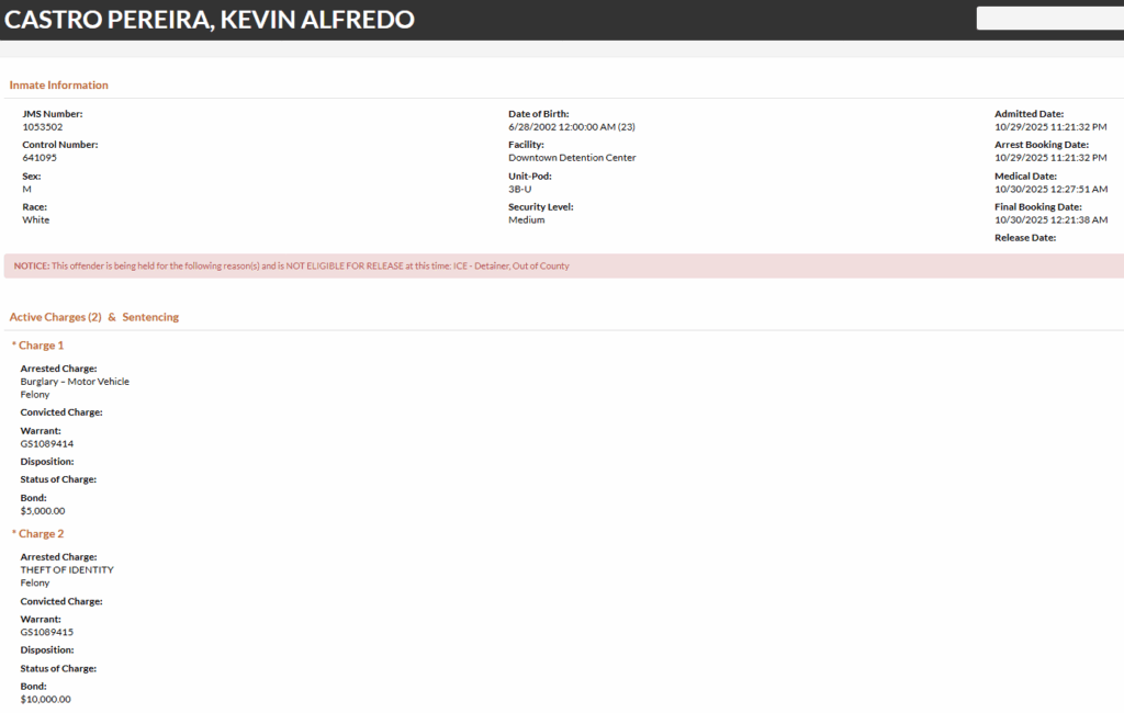 23-year-old Kevin Alfredo Castro Pereira – arrested October 29