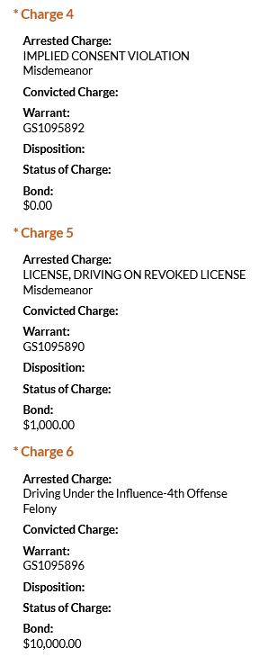 • Mejia-Alvarado was charged with driving under the influence (4th offense), driving on a revoked license, implied consent violation, resisting stop/frist/halt/arrest/search, criminal impersonation, and insurance (evidence of compliance). He was booked on an $18,000 total bond. His record shows a previous charge of DUI in April 2023. He was found guilty on that charge and was given 11 months, 29 days of probation.
