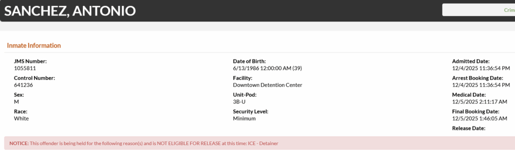 • Sanchez was charged with driving under the influence, insurance/evidence of compliance, and driver’s license required. He was booked on a $12,000 bond. Sanchez was recently arrested on November 3 for driving under the influence as well, along with two additional charges of implied consent – civil and no driver’s license.