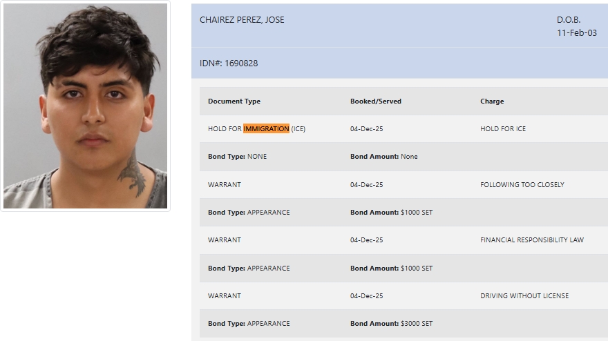 • Perez was charged with following too closely, financial responsibility law, and driving without a license. He was booked on a $5000 bond.